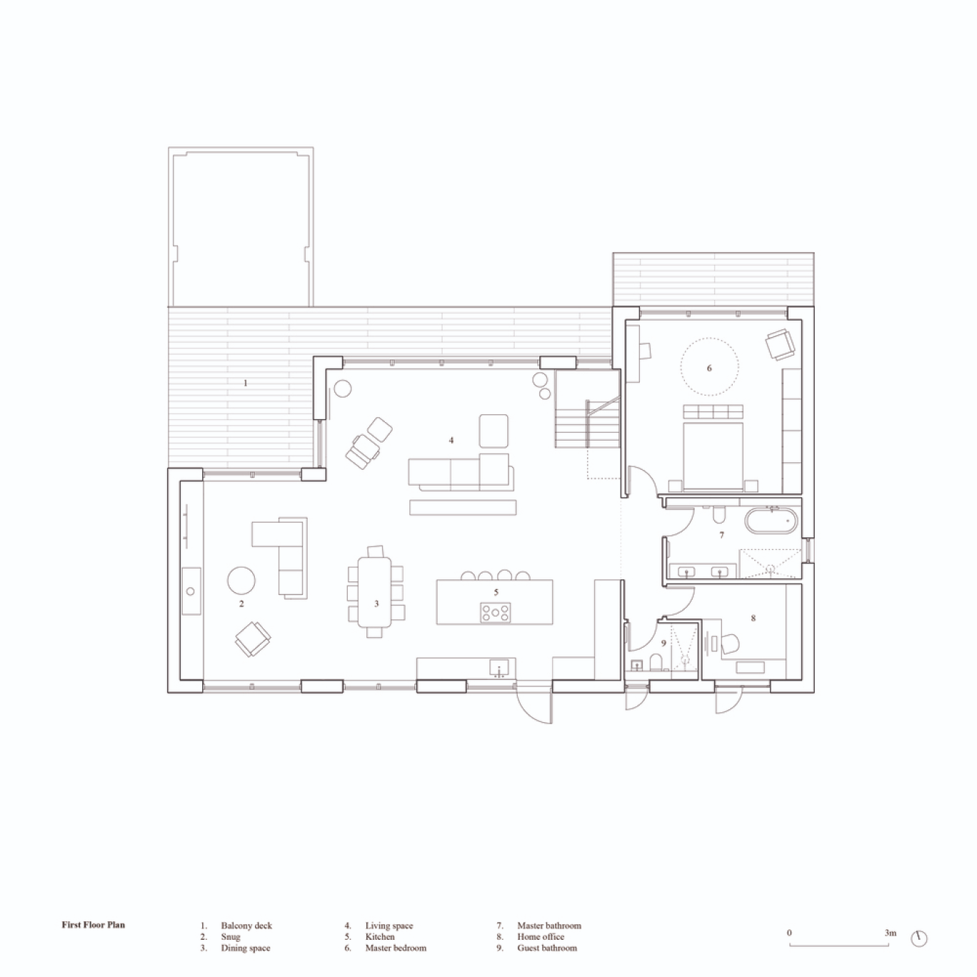 The layout supports shared living while preserving autonomy. Two private bedrooms are separated at opposite ends of the structure, joined by a central common area for cooking, study, and reflection. Above, an open-air second-floor terrace hosts an urban garden, offering residents the chance to grow food and cultivate self-sufficiency while strengthening their relationship to environment and routine.